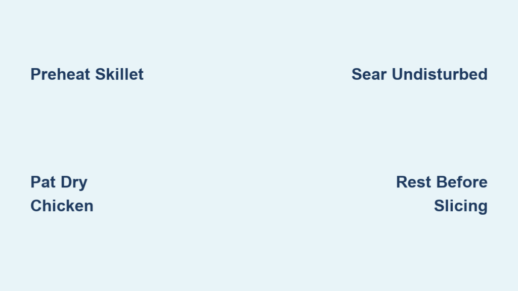 Place chicken presentation-side down (the smoother, more attractive side) and resist moving it for the full searing duration. Properly heated cast iron creates an immediate seal that prevents sticking—moving the chicken breaks this seal. Listen for aggressive, consistent sizzling, indicating proper browning is occurring.