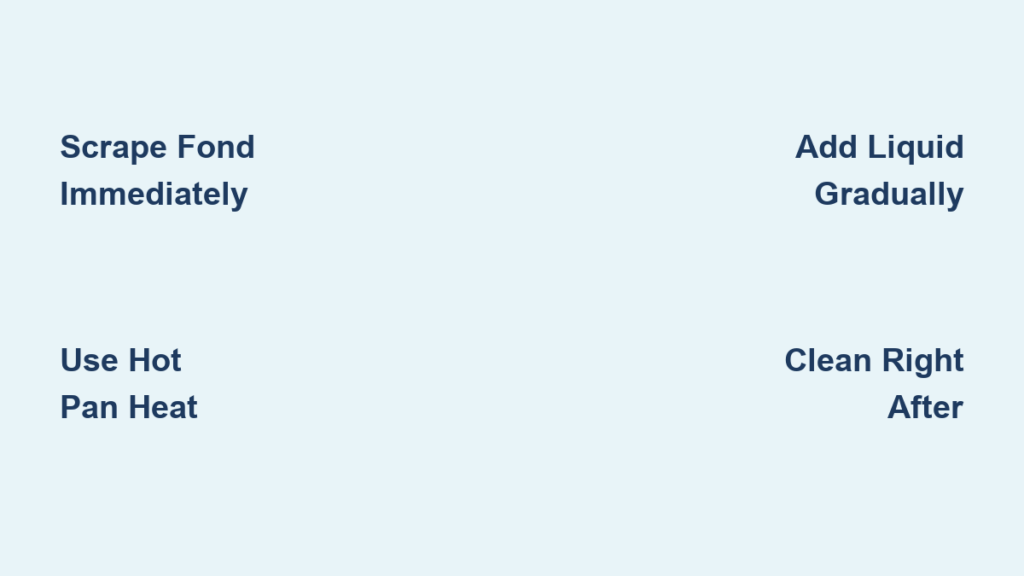 Fond that refuses to release indicates either insufficient pan heat or fond that has bonded too strongly—return the pan to medium heat and add more liquid. For stubborn fond, brief soaking in warm water helps loosen particles without risking rust.